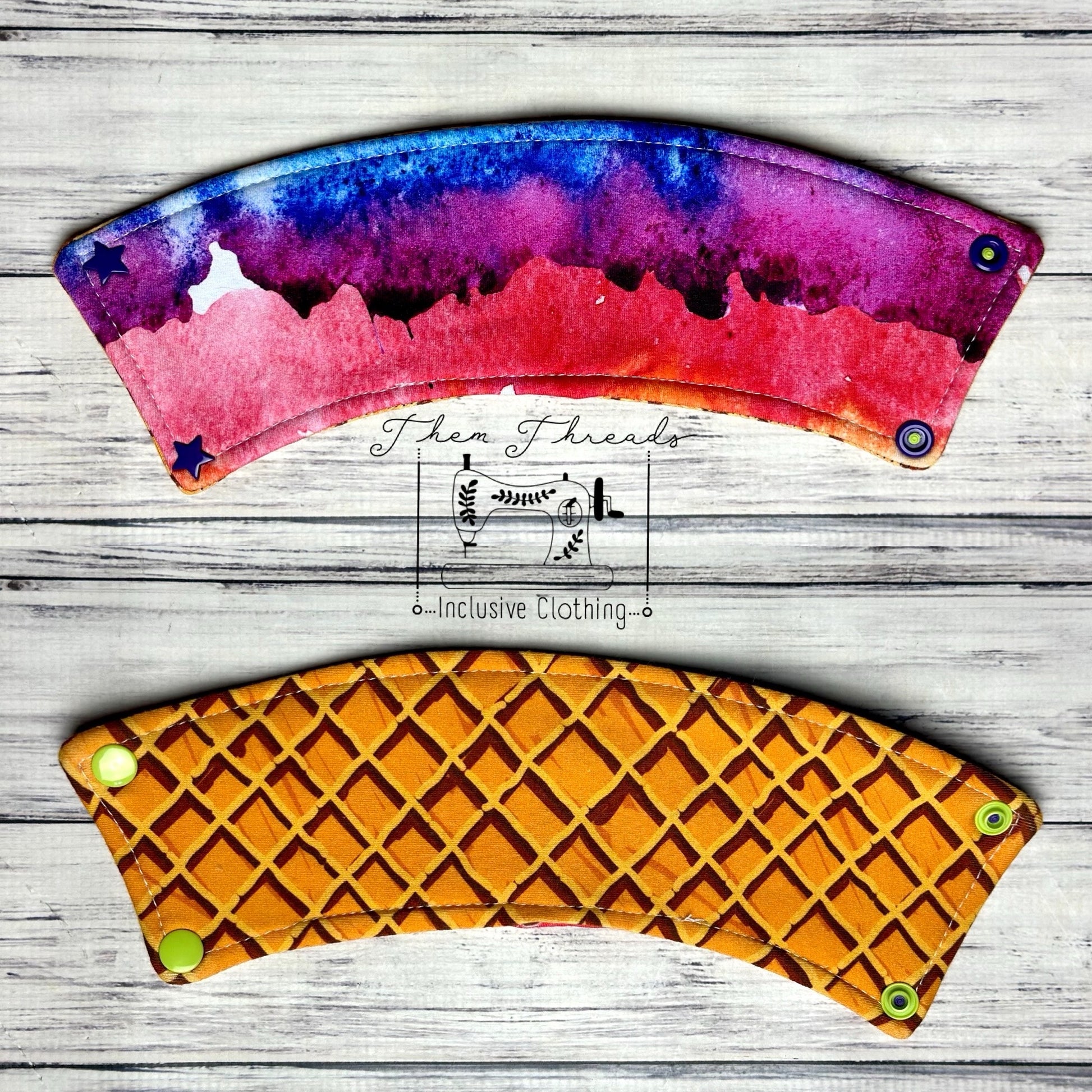 These awesome cups sleeves are reusable, reversible, and eco-friendly. They are designed to fit 12 to 16 oz. tapered cups.